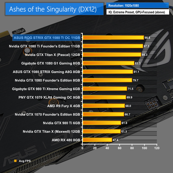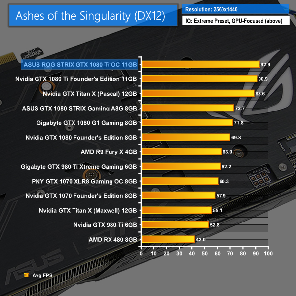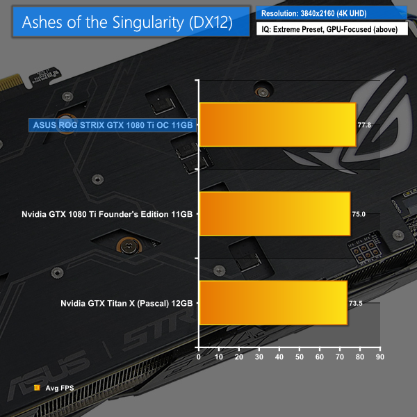 A clean-sweep of chart-topping displays by the ASUS ROG STRIX GTX 1080 Ti OC in Ashes of the Singularity. At 1440p, the ASUS card is 2.2% faster than the Founder's Edition. That lead increases to 3.7% at 4K.