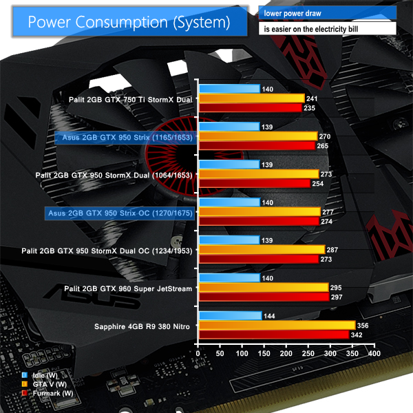 Power draw for the GTX 950 is low. Using a heavily-overclocked Core i7 5960X CPU (which would never be paired with this kind of GPU), the system power draw remained below 300W when playing GTA V.