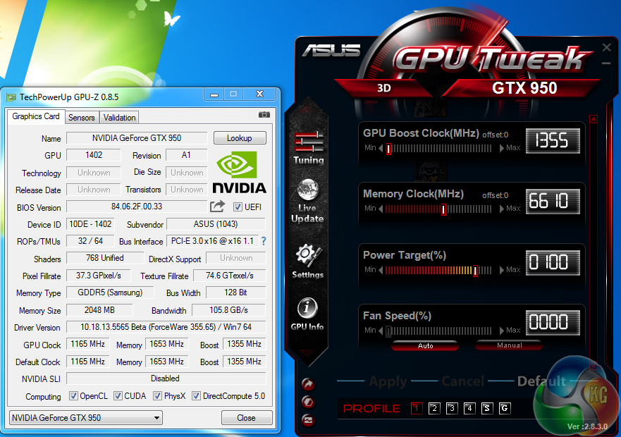 Asus ships the STRIX GTX 950 DC2 OC with a factory-overclocked setting applied. The core is rated to run at 1165MHz (141MHz greater than reference) with boosts up to 1355MHz (167MHz greater than reference), while memory is overclocked by a minor 10MHz to 6610MHz effective. We recorded the core boosting as high as 1392MHz over extended periods of gaming in our well-cooled system.