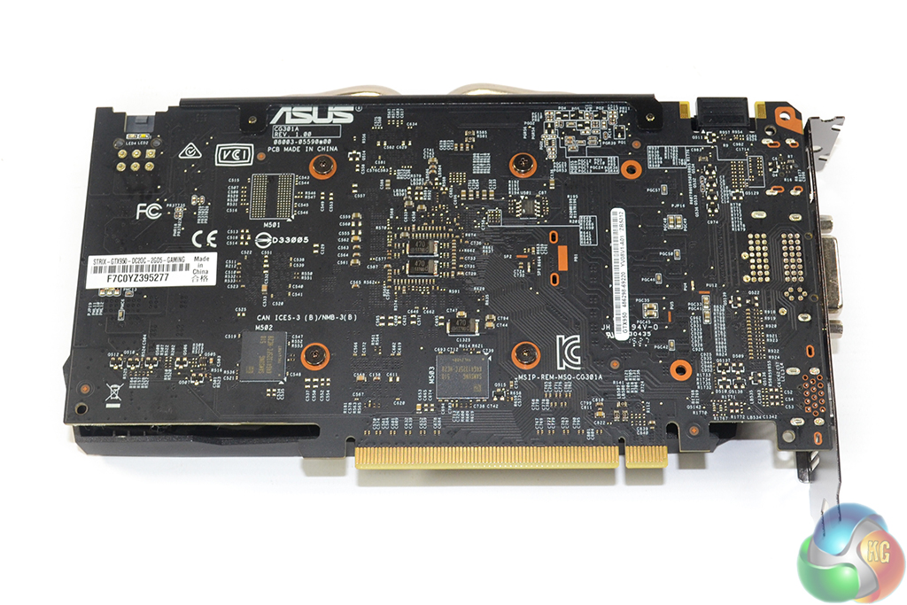 The small PCB has a very clean look to it thanks to Asus' automated manufacturing process. A pair of 4Gb Samsung GDDR5 memory chips (marked K4G41325FC) are found on either side of the PCB to form the 2GB VRAM capacity. Asus clocks the card's memory 3MHz above the reference frequency of 1650MHz. Two unused spaces for memory chips are visible, so this implies that Asus is recycling its PCB design, or Nvidia has a slightly tweaked card in the works.