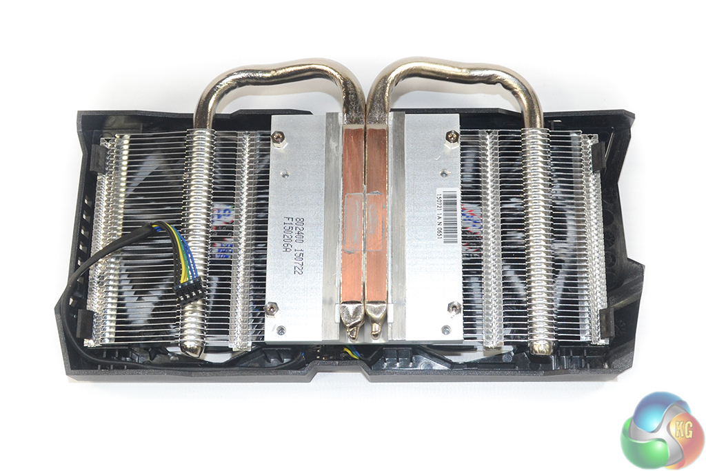 Two 8mm direct-touch copper heatpipes transfer thermal energy directly from the GPU to an aluminium fin array with a 1725.56cm2 dissipation area. The pair of fans, which we measured at 75mm blade-area diameter, feature Asus' patented pressure-enhancing design. According to Asus, its engineers have borrowed a few tricks from the aerospace industry in order to create 105% more air pressure from the wing-blade design.