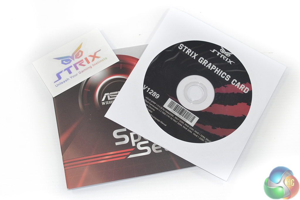 Asus ships the STRIX Gaming GTX 950 DC2 OC in packaging featuring the owl branding. A drivers CD, manual, and sticker form the bundle.