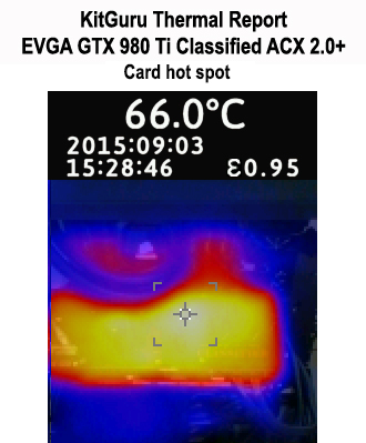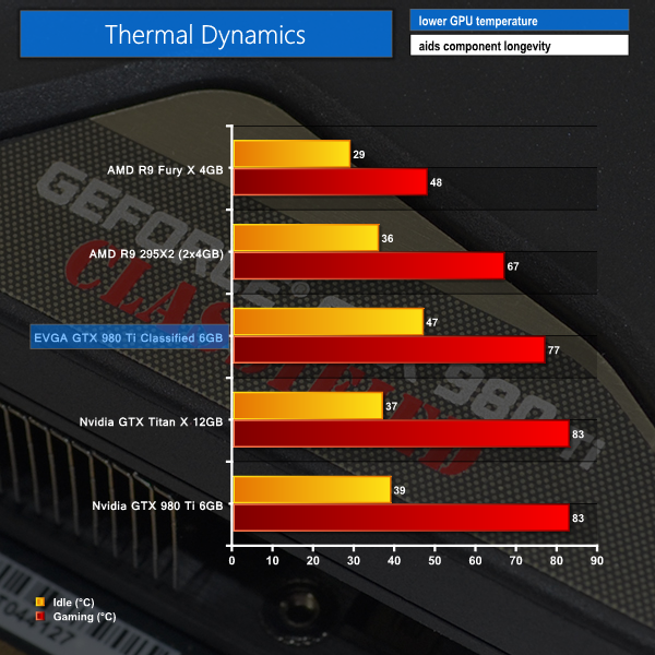 The 0dB mode of EVGA's card sees idle temperatures register 47°C. This is comfortable for a card that is silently sat at the Windows desktop or just browsing the web. Load temperatures hit 77°C, which leaves a safe margin between the 83°C thermal threshold of Nvidia's GTX 980 Ti GPU.