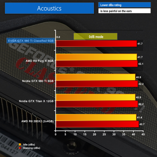 The high ambient noise in my city-centre test location makes it difficult to record acoustic differences between each card. I can, however, say that subjective listening proved that EVGA's solution was virtually inaudible at lower fan speeds and was barely audible when hitting the maximum – 44% – fan speed level that we recorded.
