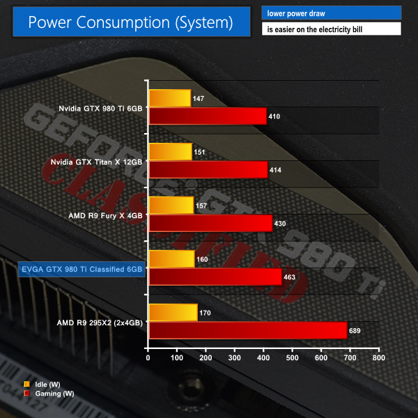 Unsurprisingly, EVGA's factory-overclocked GTX 980 Ti Classified consumes more energy than the reference board, despite its enhanced power delivery system design. An extra 53W on top of the GTX 980 Ti reference board power draw puts EVGA's GTX 980 Ti Classified right on its 300W rated TDP.