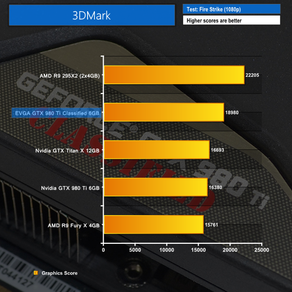 EVGA's factory-overclocked GTX 980 Ti makes a strong start in the 3DMark tests. A combination of the higher core- and boost-clock speeds, as well as enhanced cooling capacity which alleviates thermal throttling worries, gives the EVGA GTX 980 Ti Classified a 16% performance increase over Nvidia's reference board for 3DMark's 4K test.