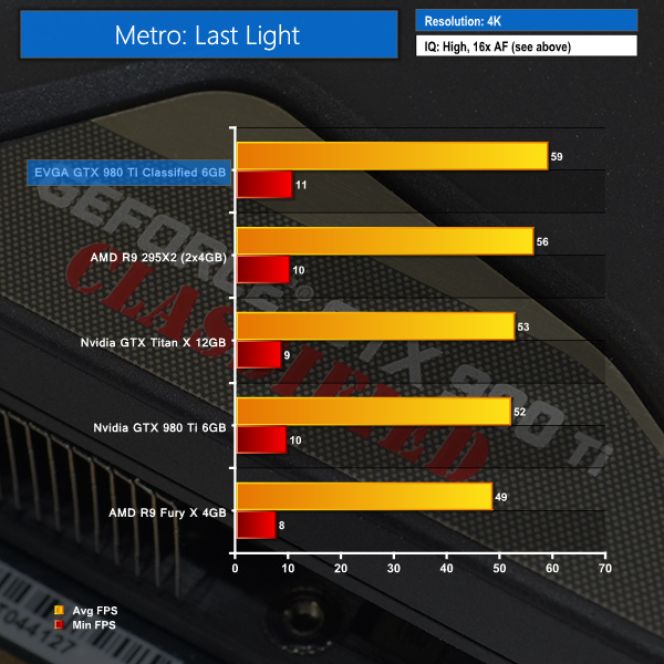 With a healthy out-of-the-box overclock applied to the core of EVGA's card, an average frame rate of almost 60 FPS is achieved while using Metro's High quality setting and a 4K resolution.