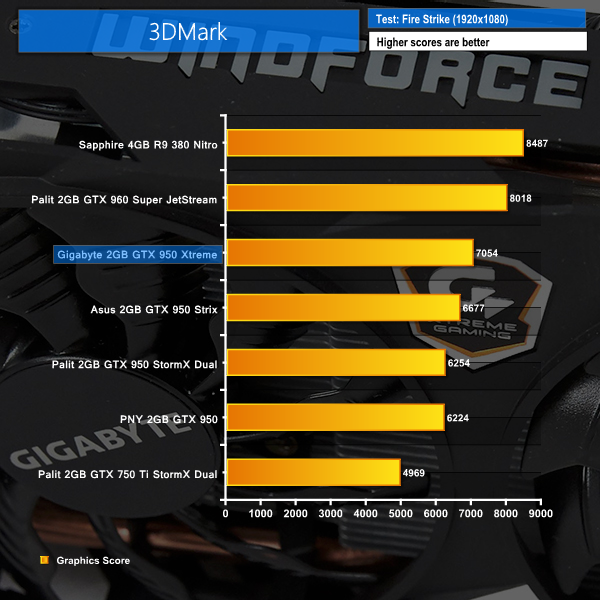 The massively overclocked speed of the Gigabyte GTX950 Xtreme Gaming card propels the solution ahead of other cards in the same price zone. It is only 1,000 points behind the Palit GTX960 Super JetStream.