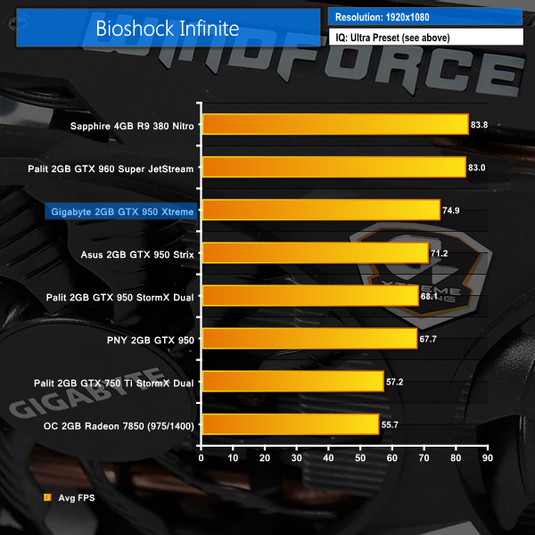 We still love this game, and we can see the Gigabyte GTX950 Xtreme Gaming 2GB card holds a marked 4 frames per second advantage over the GTX950 Strix – averaging almost 75 frames per second.