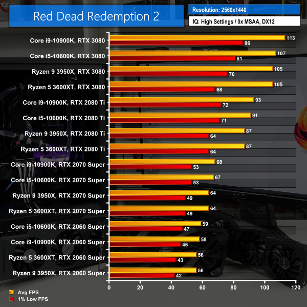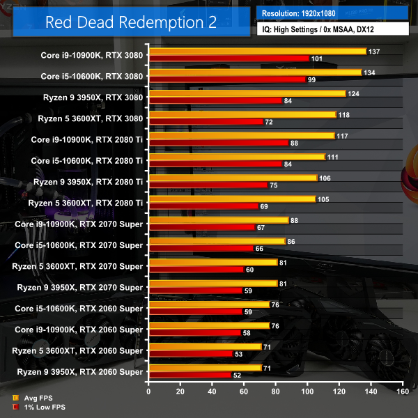 Red Dead Redemption 2 is another title that shows preference for Intel hardware. Using the High – not Maximum – IQ settings, we can get close to 140 FPS average using the RTX 3080 and 10th Gen CPUs. AMD’s Zen 2 competitors are better suited for a 120 FPS target with the powerful graphics card, though they do show less positive 1% low FPS numbers.