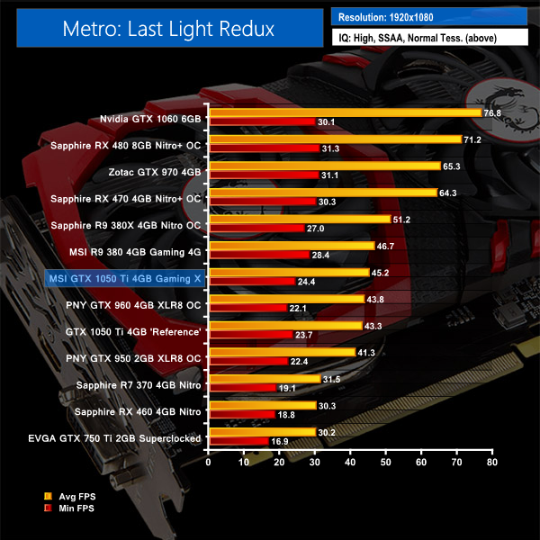 Metro: Last Light Redux is another solid DX11 title. Normal service seems to be resumed in this game, with the MSI GTX 1050 Ti sitting above the GTX 960 4GB OC card and below an R9 380.