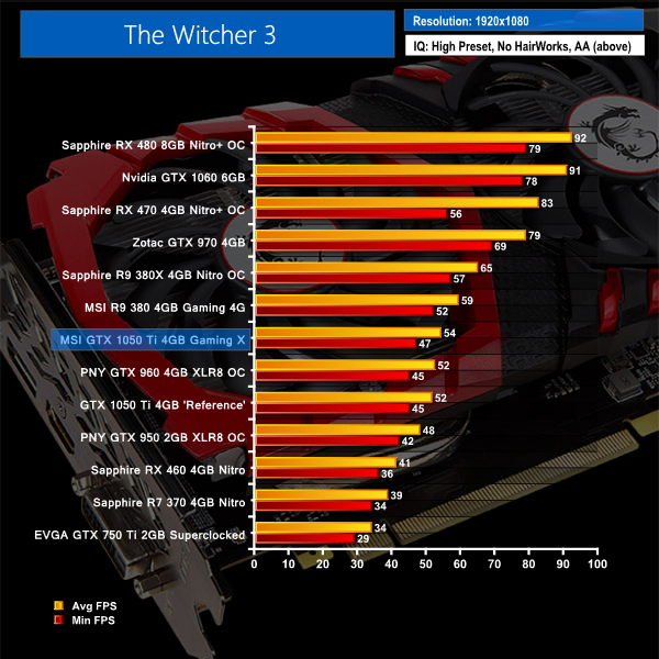 Witcher 3 restores normal order, with the MSI GTX 1050 Ti Gaming X sat below an R9 380 and above an overclocked GTX 960 4GB. A couple of extra FPS are obtained by MSI's overclocked GPU, in comparison to the reference-clocked GTX 1050 Ti.