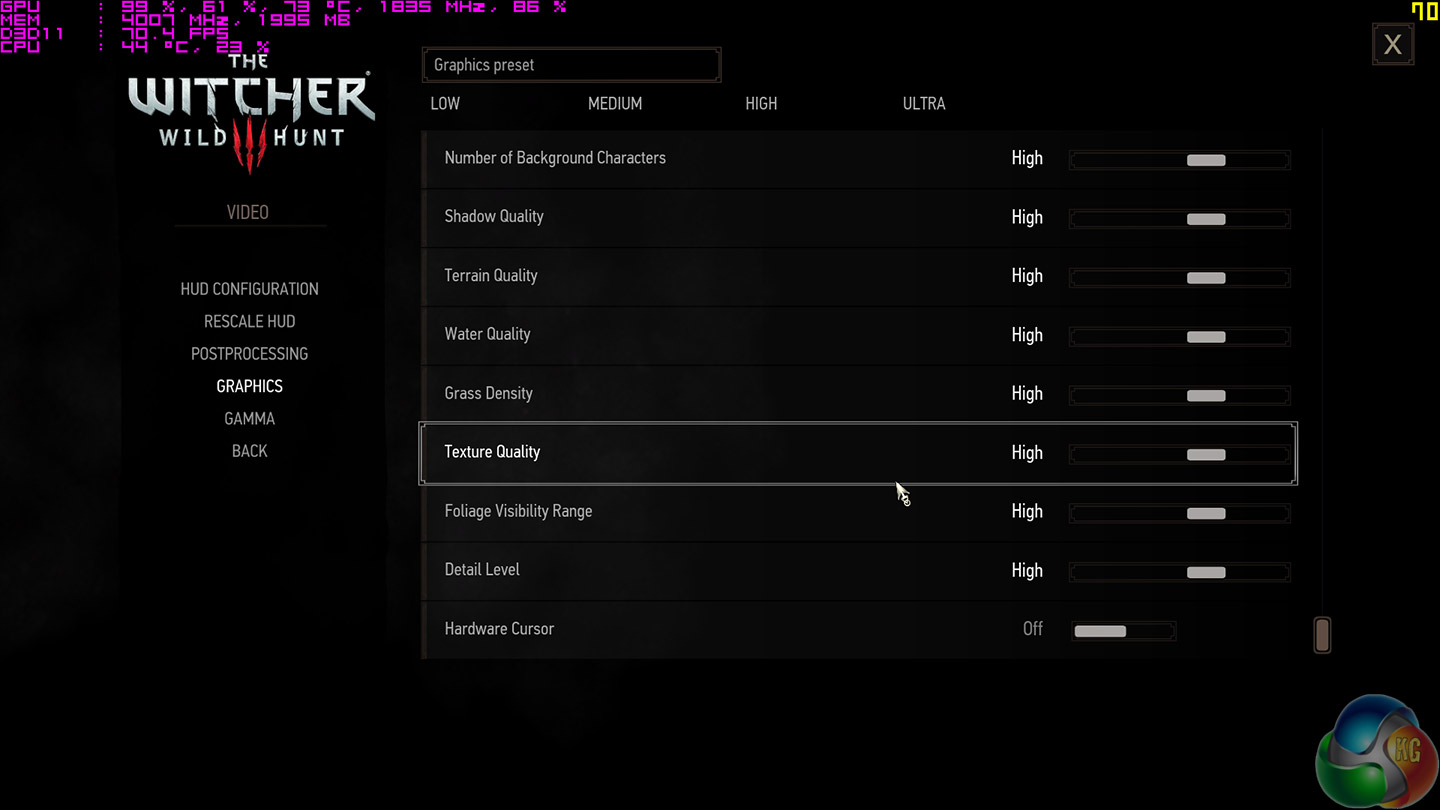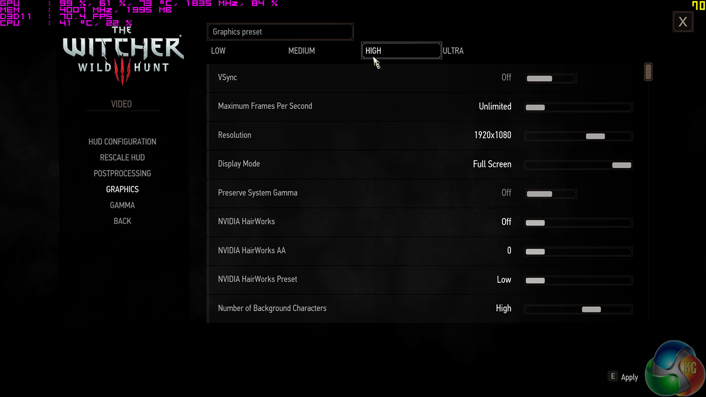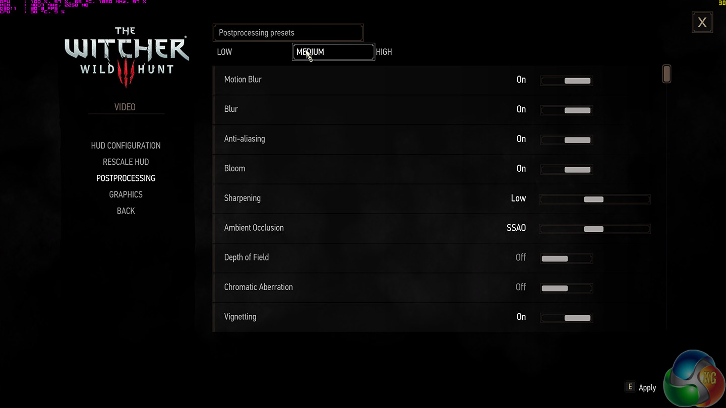 We use the High preset for general image quality, but disable the Nvidia HairWorks settings where possible. The post-processing preset is set to Medium.