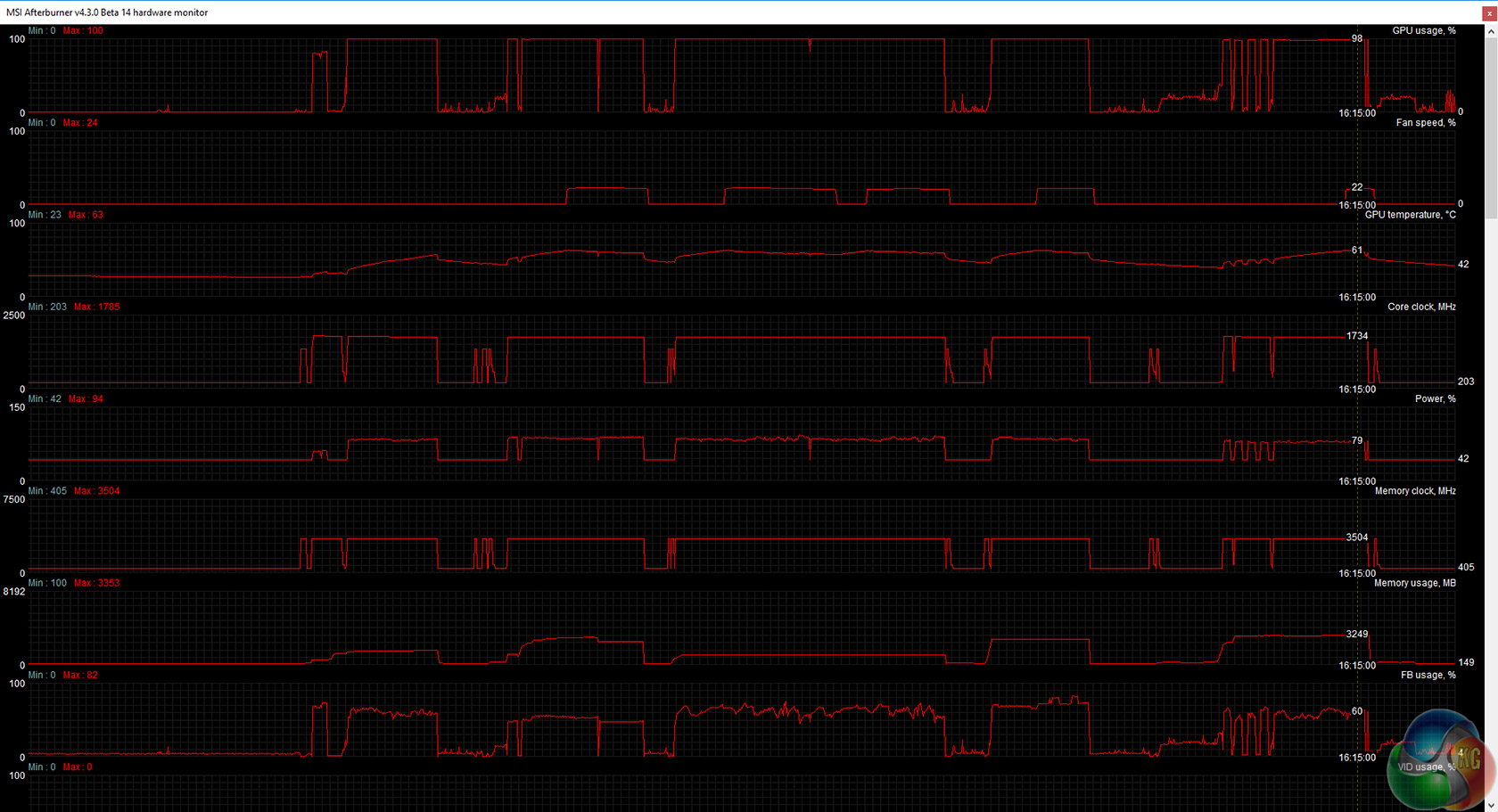 The actual boost clock speed sat around the mid-1700s level during gameplay. The clock was held back by the power limitation induced by the GPU's 75W TDP. But the power delivery can be increased to 125% using MSI Afterburner.