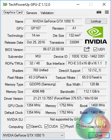 MSI overclocks the GTX 1050 Ti GPU by 64MHz in its default configuration, which results in a 76MHz uplift on the Boost Clock. The GDDR5 memory is left at its default speed of 7Gbps effective.