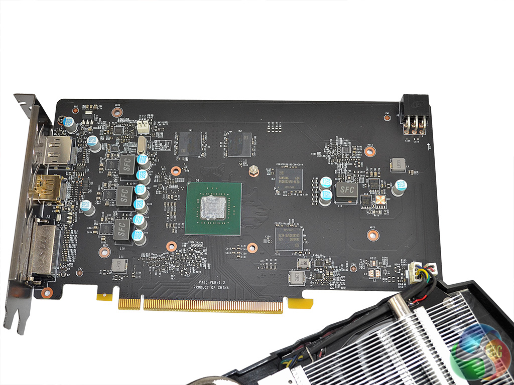 A sparse PCB is home to the GTX 1050 Ti's GP107 chip built on Samsung's 14nm FinFET process. Surrounding the GPU are four 1GB Samsung GDDR5 memory chips. The power delivery solution looks to be a 3+1 phase design. MSI opts for Solid Ferrite Chokes (SFC) in a bid to inject quality into the system and minimise coil whine.