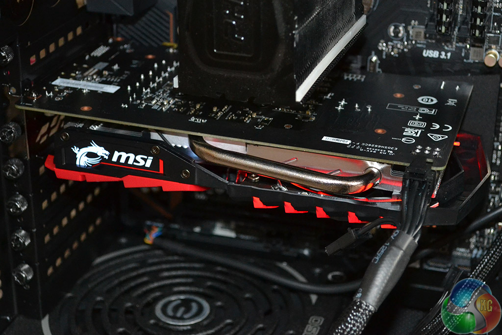 The MSI logo is illuminated by a white LED, while red LEDs light the rest of the graphics card. While it is difficult to highlight in a photograph, the red LED lighting does an excellent job of working with the shroud grooves to create a dragon-resembling angular appearance.