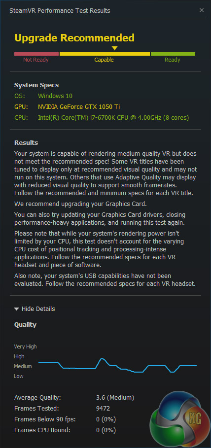 If you want to buy MSI's overclocked GTX 1050 Ti for VR purposes, the Steam VR test indicates that the card is ‘Capable‘. With that said, average quality is Medium and there is a suggestion that an improved graphics card would be a wise purchase.