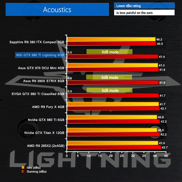 The use of three 90mm fans with a thick heatsink means that the blowers can spin at a low (therefore quiet) speed while still producing solid thermal performance. This is what we see with MSI's GTX 980 Ti Lightning which is practically inaudible over our background even when running GTA V at 4K.