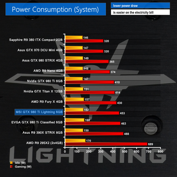 The MSI GTX980 Ti Lightning takes power from three separate power connectors – two 8 pin connectors and an additional 6 pin power connector. MSI are making sure that those people who use LN2 to overclock will never run into power delivery issues. As we can see, this MSI card takes more power at the wall than the AMD Fury X and Nvidia Titan X.