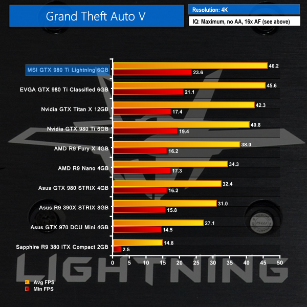 We set all of GTA V's settings to their highest levels for both resolutions but made sure to disable the performance-crippling MSAA settings. We saw the game use almost 4GB of VRAM at 2560×1440 and around 4.5GB at 4K (where possible with the relevant video cards). The built-in benchmark is used to gather performance data.