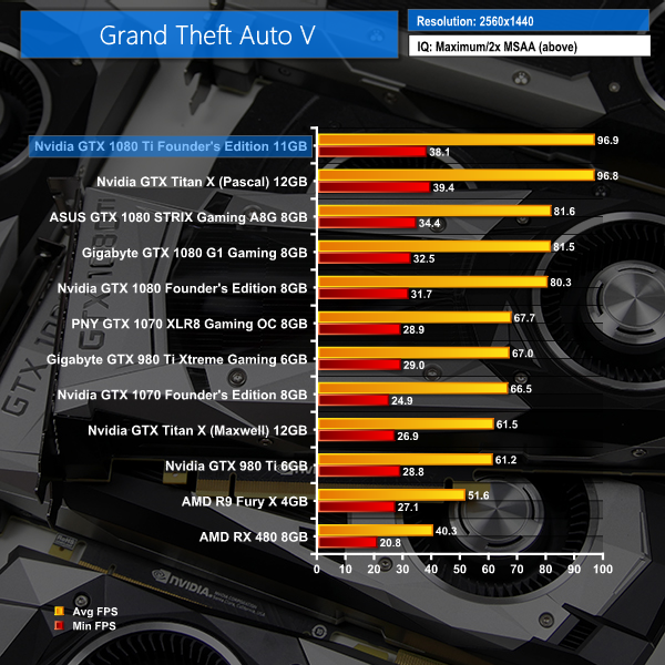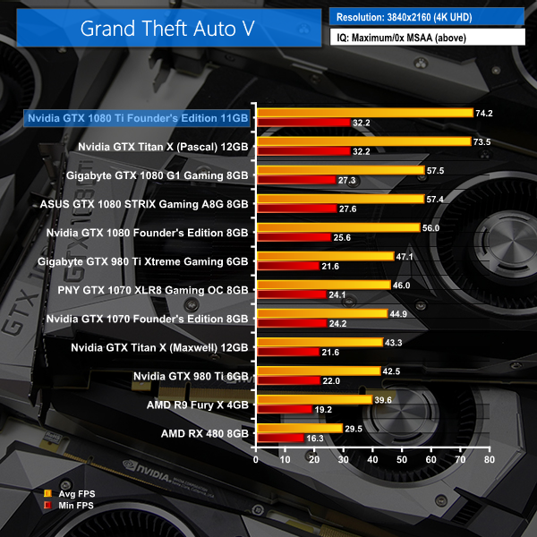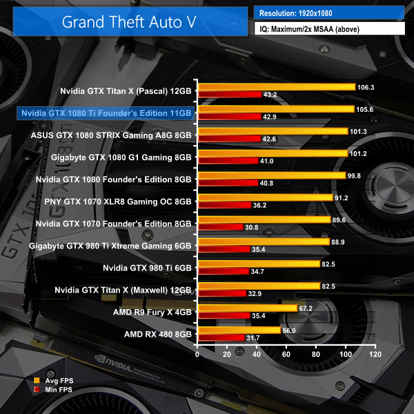 GTX 1080 Ti FE can push an average frame rate of more than 100 FPS at 1080P in GTA V. That number stays close to 100 FPS when the resolution is cranked to 1440P and image quality settings remain at their maximum levels with 2x MSAA. GTX 1080 Ti FE delivers a solid 4K60 experience with settings set to the highest levels (no AA) in GTA V.