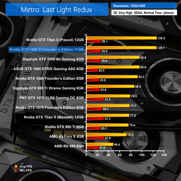 If you game at 1080P on a high-refresh rate monitor, GTX 1080 Ti can keep you above 120 FPS average using the same settings as we did. The magic 60FPS mark is also surpassed at both 1440P and 4K (with less demanding IQ settings). The performance increase for GTX 1080 Ti over GTX 1080 is 37% at all three resolutions. How about that for consistency?