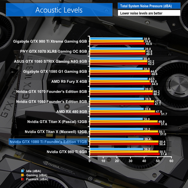 With the same cooler as the Titan X Pascal being used on the GTX 1080 Ti FE, it is no surprise that their acoustic levels are very similar. At gaming load the GTX 1080 Ti is certainly audible but I wouldn't call it intrusive. At 49% fan speed in games that don't force the fans on an AIO liquid CPU cooler to ramp up too high, the GTX 1080 Ti FE is clearly the most audible component inside our test system.