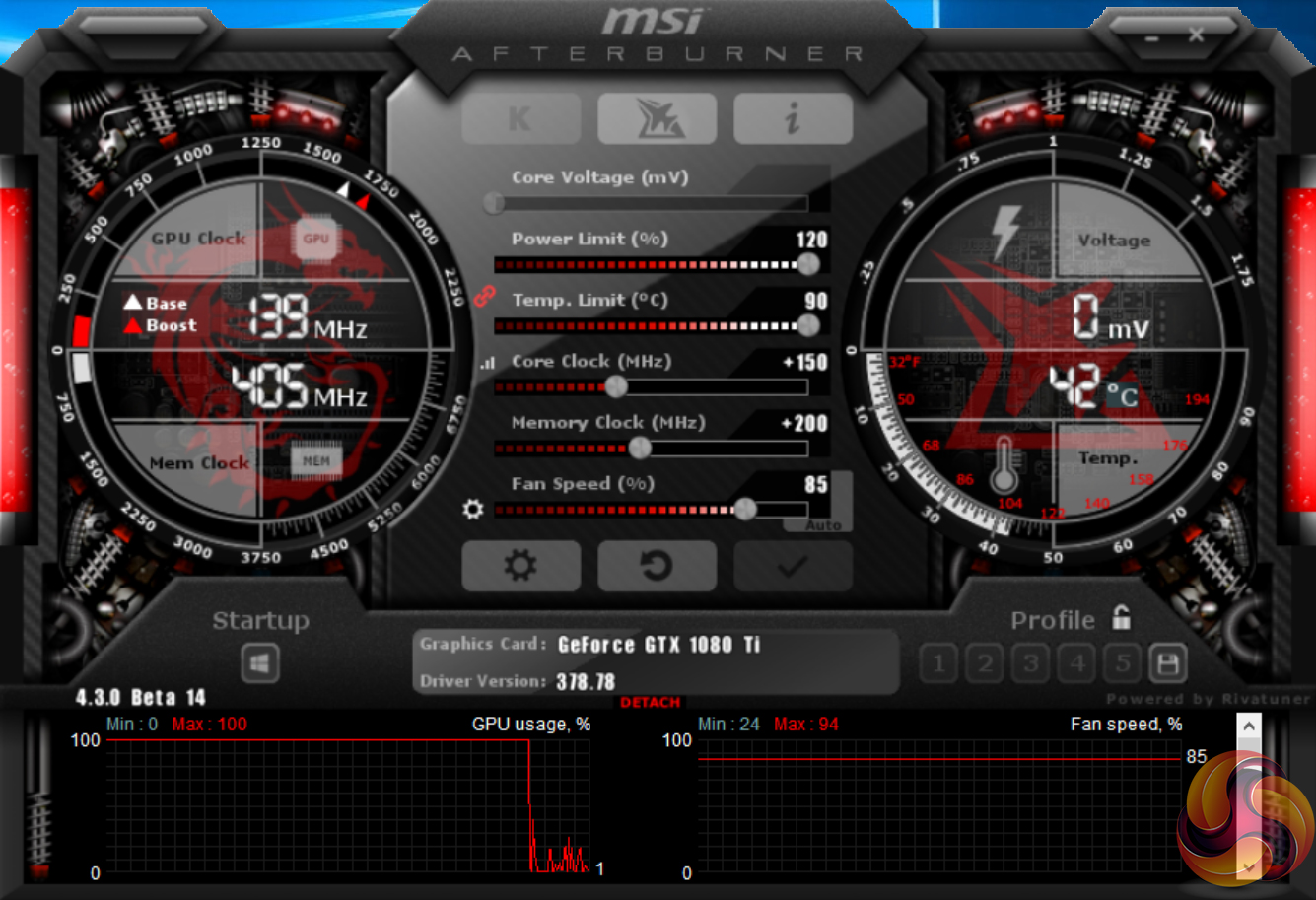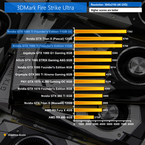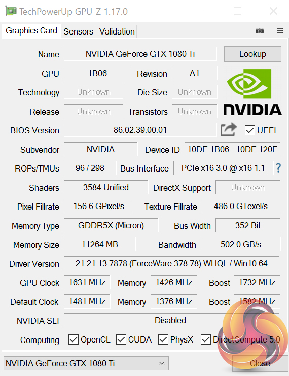 Nvidia claims that the GTX 1080 Ti GPU was able to hit around 2GHz in their own testing. We can't disagree with that as GPU Boost 3.0 took the core clock on our card to 2GHz for periods of the 3DMark Fire Strike Ultra test run.