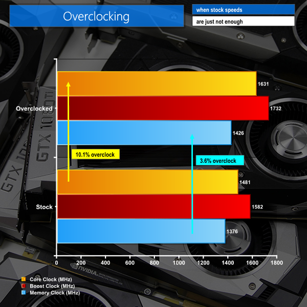 Overclocking the GPU core and GDDR5X VRAM resulted in a solid performance boost for the GTX 1080 Ti. Gears of War 4 saw a 10% up-tick and Rise of The Tomb Raider ran 9% faster.