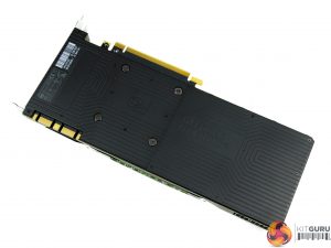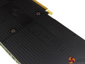 Backplate design follows the same two-plate split methodology applied for the GTX 1080 Founder's Edition and Titan X Pascal cards. Two thin metal backplates connect separately to the rear PCB allowing them to be removed individually. This has the benefit of allowing the single backplate piece residing behind the radial fan to be removed to create a small cooling gap if a pair of GTX 1080 Ti cards is installed back-to-back in SLI.