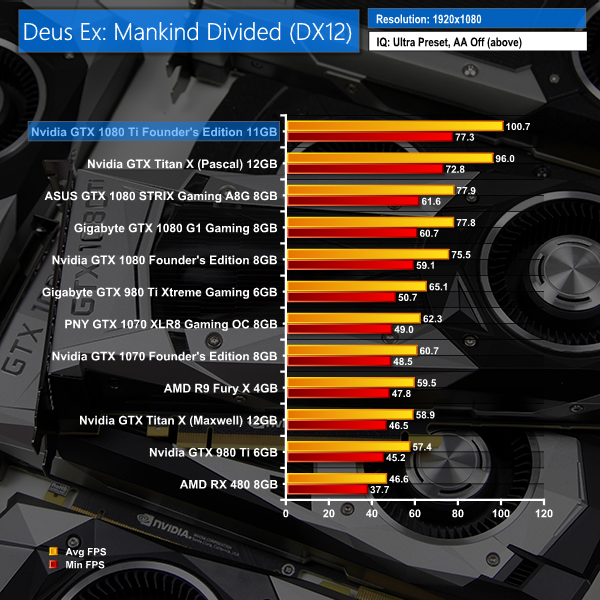 GTX 1080 Ti delivers an average frame rate of more than 100 FPS in Deus Ex's challenging Ultra setting at 1080P. The card also makes the game playable at 1440P with Ultra quality. All three resolutions favour the GTX 1080 Ti FE and its higher clock speeds over the vastly more expensive Titan X Pascal.