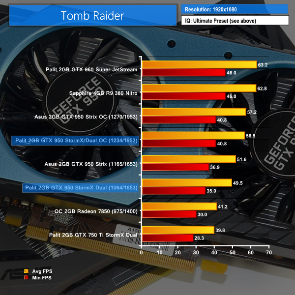Tomb Raider performance is boosted close to the magical 60 FPS-mark when Palit's card is overclocked. Even at out-of-the-box levels, an average frame rate of almost 50 FPS when using the Ultimate IQ preset is solid performance.