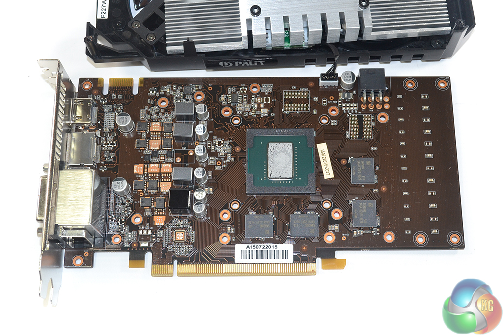 Palit extends the small PCB slightly past the 6-pin power connector in order to provide additional rigid mounting area for the dual-fan cooler.