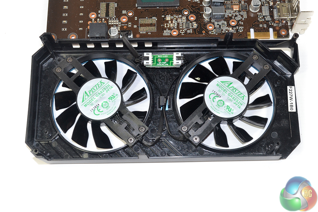 Palit's cooler can switch its fans completely off when the GPU core runs below a certain temperature. So when you are browsing the web or even doing some light gaming, the cooler's fans enter their 0 dB mode. That is positive for users trying to build a quiet system that also has good cooling performance while gaming.