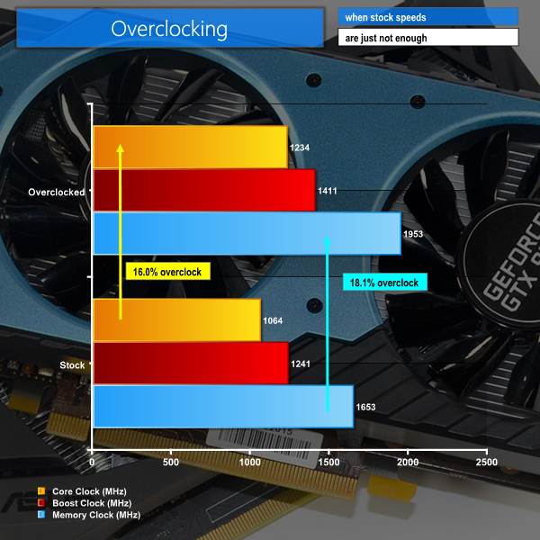 We know that the GM206 GPU has far more headroom in it than reference or board partner speeds would suggest, so we pushed to see how far we could overclock Palit's GTX 950 StormX Dual card.