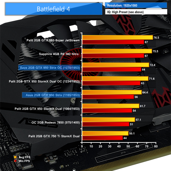 More of the same is shown with Battlefield 4 – Asus' GTX 950 is a little faster than Palit's out-of-the-box. Palit's cost-effective GTX 950 solution is, however, able to outperform the overclocked Radeon 7850 in Battlefield 4.