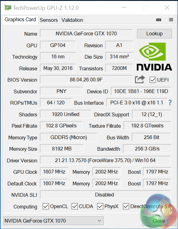 PNY overclocks the core to 1607MHz (1797MHz Boost) which is an aggressive increase from the 1506MHz/1683MHz reference GTX 1070 FE frequencies. Memory is left unchanged at 8Gbps effective.