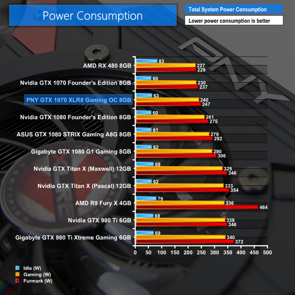 The GP104 Pascal GPU for Nvidia's GTX 1070 is extremely efficient and sips power. A 150W rated TDP for the GTX 1070 puts its power draw numbers close to the AMD RX 480 towards the top of our chart. Less than 250W system-wide power draw while providing strong 1440P performance is a good trait for PNY's GTX 1070 XLR8 OC card.