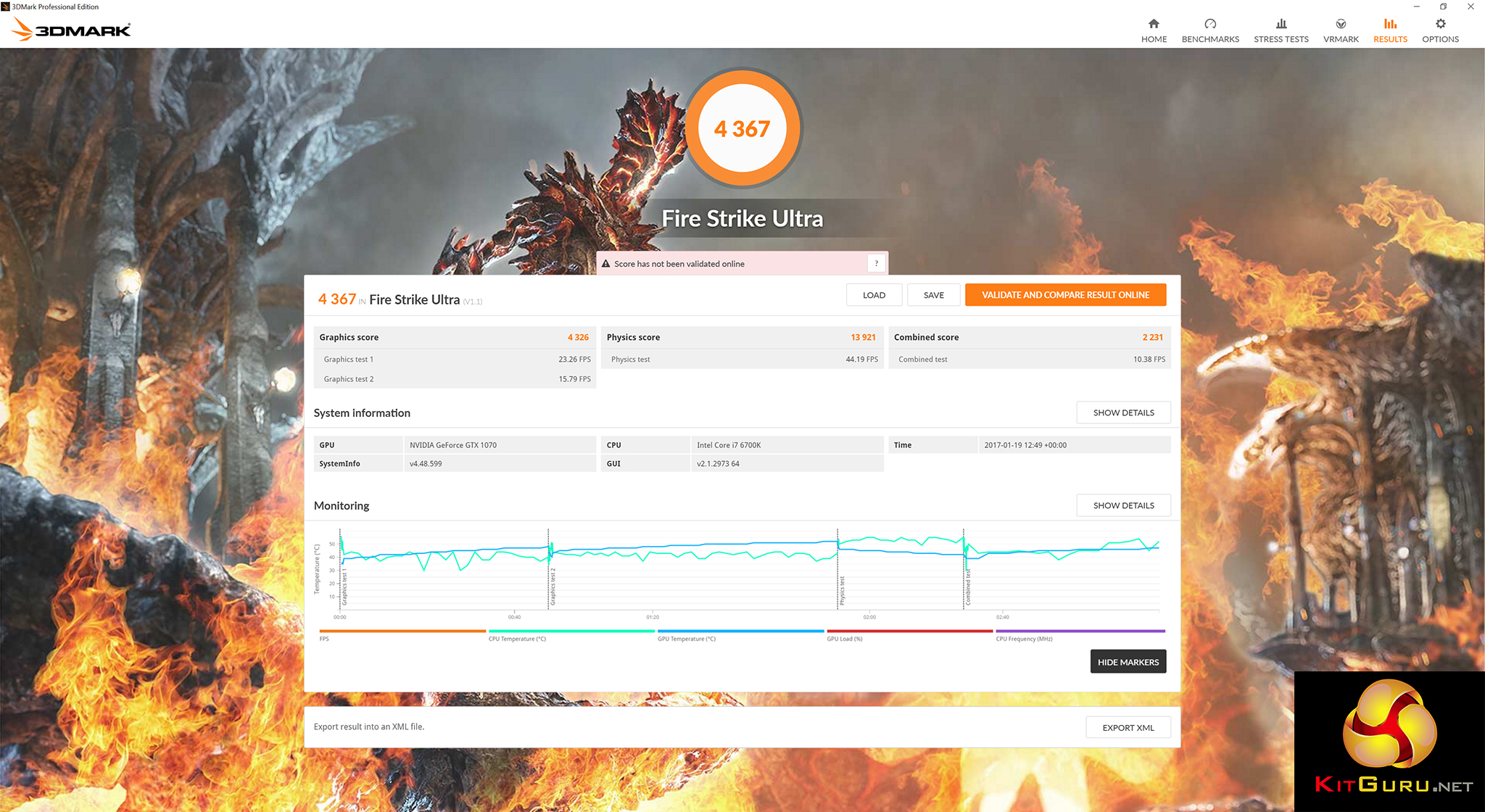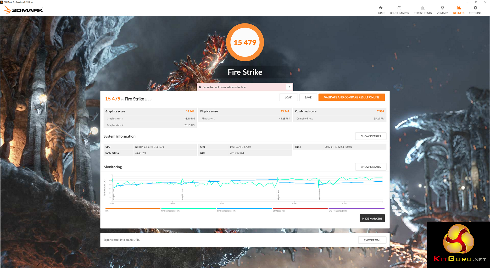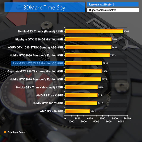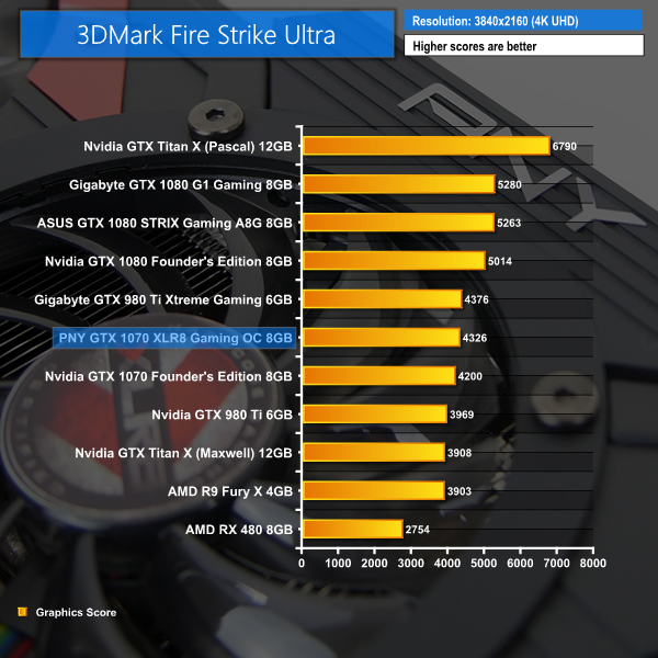 Strong performance is shown by PNY's GTX 1070 XLR8 OC in the 3DMark tests. The overclock to its core allows PNY's card to outperform a Founder's Edition GTX 1070 by a small margin. Gigabyte's heavily overclocked GTX 980 Ti from the Maxwell generation is generally a slight bit faster than the GTX 1070 XLR8 OC.