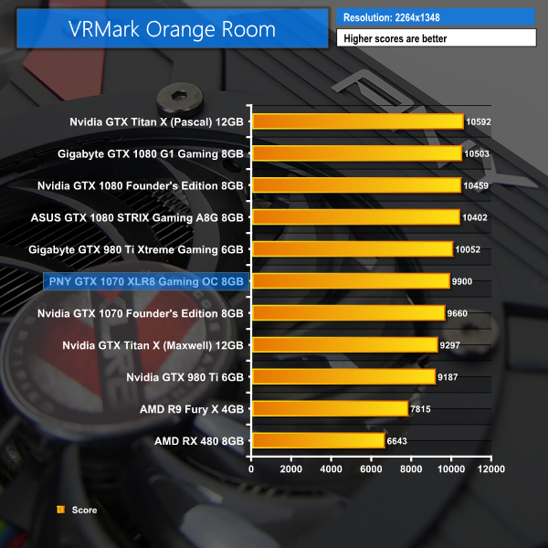 It's more of the same with VRMark – the PNY card sits above a GTX 1070 FE and below Gigabyte's overclocked GTX 980 Ti in terms of performance. The GTX 1080 cards cannot be touched, even with a solid overclock applied to the core of the GTX 1070 XLR8 OC model.