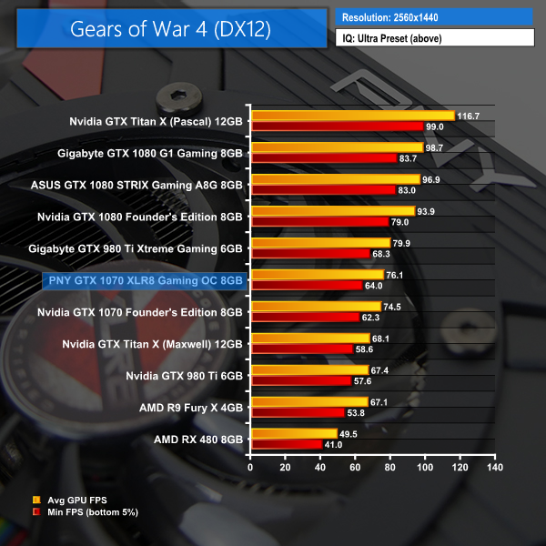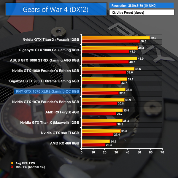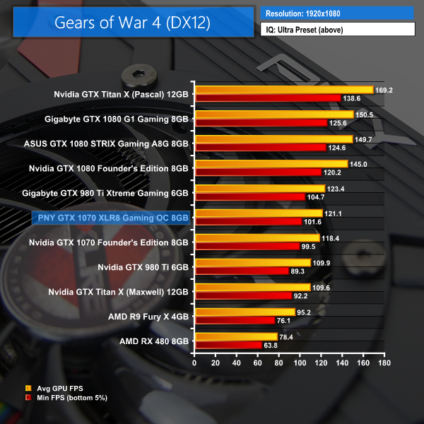 Gears of War 4 shows the exact same trend at all resolutions – the overclocked GTX 980 Ti sits directly above PNY's card while the GTX 1070 FE is below it.