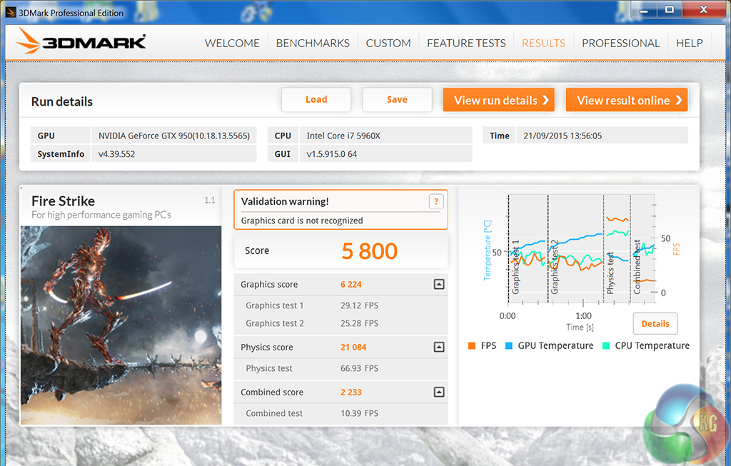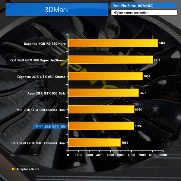The almost reference clock speeds of the PNY GTX950 mean it can't really compete with the faster Gigabyte and ASUS solutions. It is significantly quicker than the GTX750 Ti however, scoring 6,224 points.