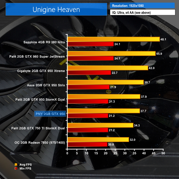 The PNY GTX950 falls into the position we would expect, averaging almost 38 frames per second at these settings.