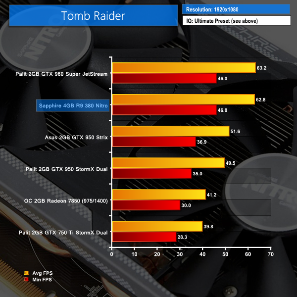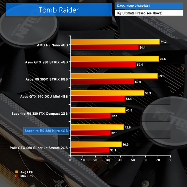 Tomb Raider runs well on both Nvidia and AMD hardware. The R9 380 and GTX960 are very evenly matched with this game engine – holding very similar frame rates at both 1080p and 1440p.