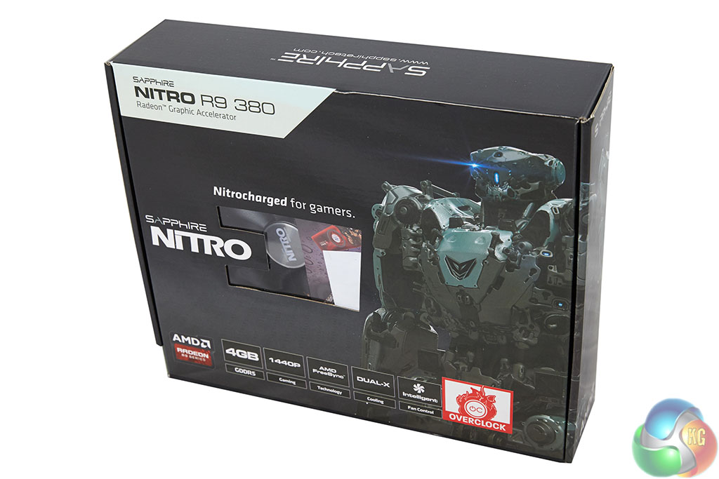 The Sapphire box artwork features another futuristic robotic render with a little window to showcase the Nitro sticker on one of the fans.