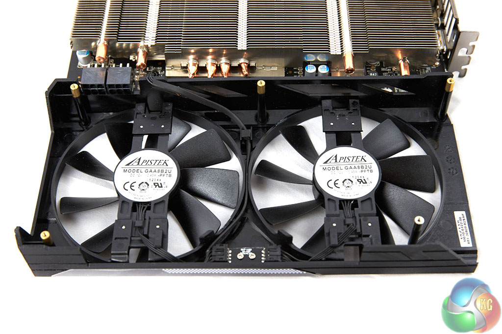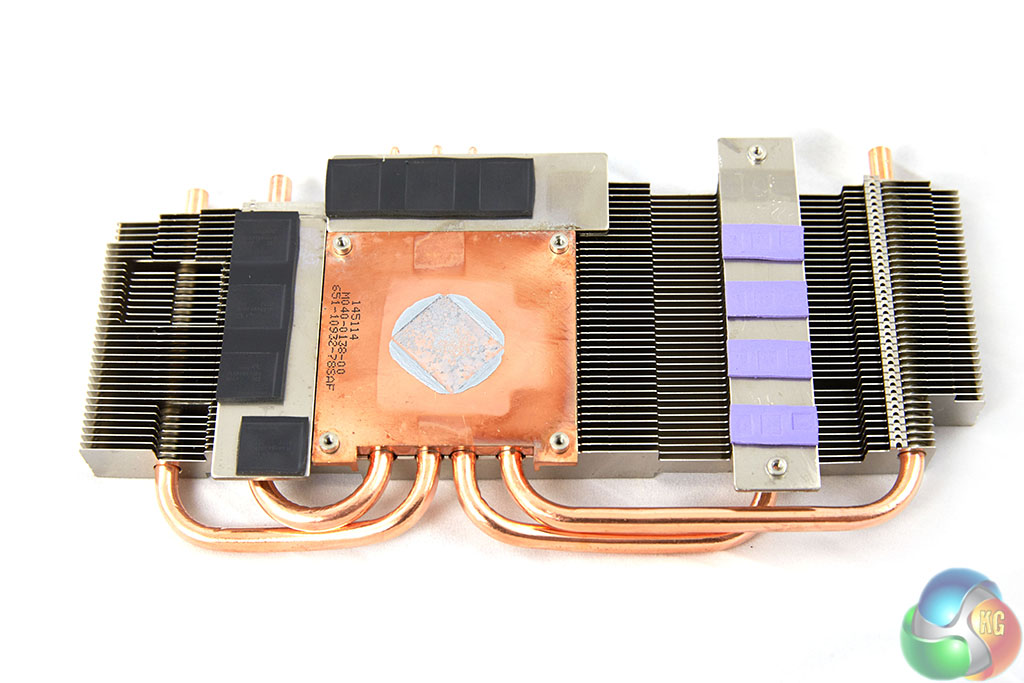 The four thick copper heatpipes run directly into a big copper base which cools the Antigua (Tonga) core – these heatpipes run into aluminium fins on either side of the GPU core to quickly disperse the heat. Memory and VRMs are actively cooled by the heatsink as well.