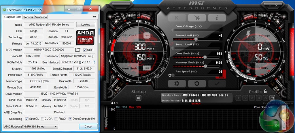 GPU-Z depicts an overview of the Sapphire R9 380 Nitro – which is basically the same as the last generation R9 285, with higher core and memory clocks. AMD's Antigua Pro (Tonga) core is built on the 28nm process. There are 32 ROP's, 112 Texture units and 1792 Stream Processors. The 4GB of GDDR5 memory runs at 1,450mhz (5.8Gbps effective) and is connected via a 256 bit memory interface. The core is running at 985mhz – slightly faster than AMD's reference clocks.
