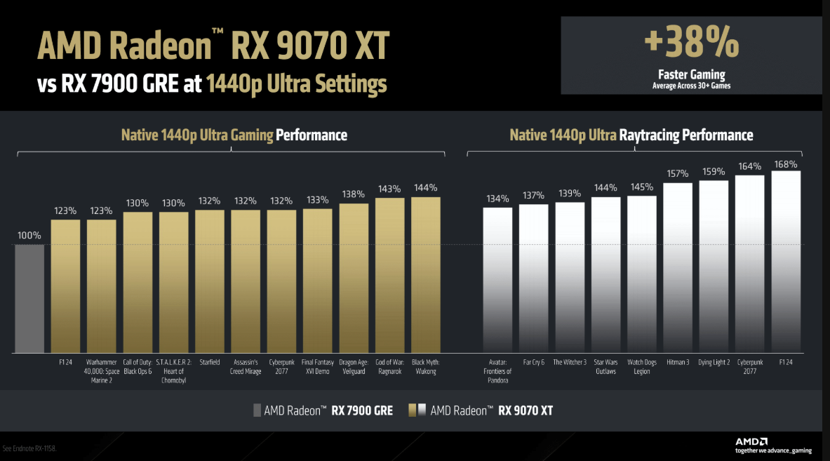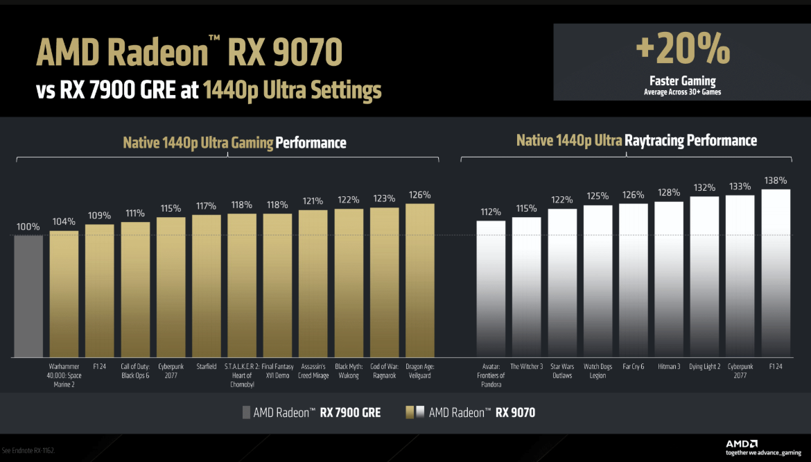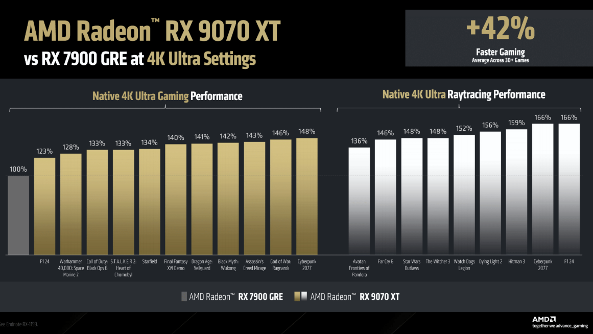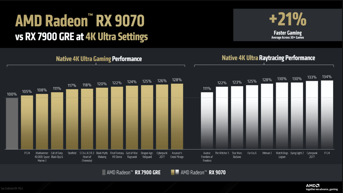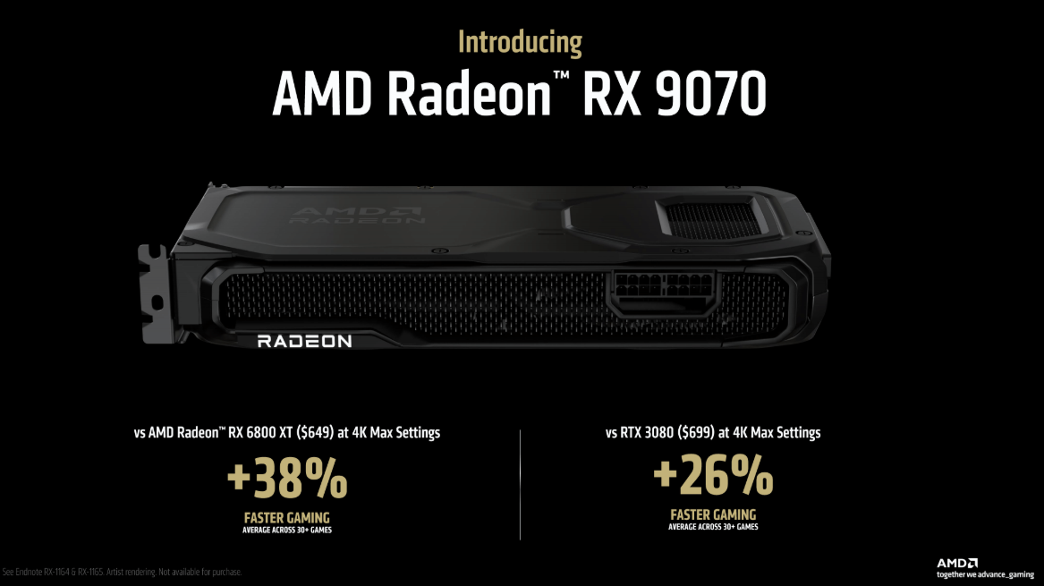 Compared to an RTX 3080 at 4K, the RX 9070 is said to be as much as 26 percent faster. This is the average score based on benchmarks across 30 games. You can also see RX 9070 vs AMD's previous gen RX 7900 GRE in the slide above, showcasing big improvements in titles like Cyberpunk 2077, Starfield, Final Fantasy 16, and more.