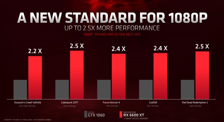 In terms of specs, the RX 6600 XT packs 32 Compute Units, 32MB of Infinity Cache, 8GB of GDDR6 memory and a 160W TDP – the ‘Game Clock' speed is set at 2359MHz. With all of that packaged together, AMD's internal testing shows up to 2.5x more performance at 1080p compared to the GTX 1060, a card that still ranks amongst the most used on the Steam Hardware Survey today.